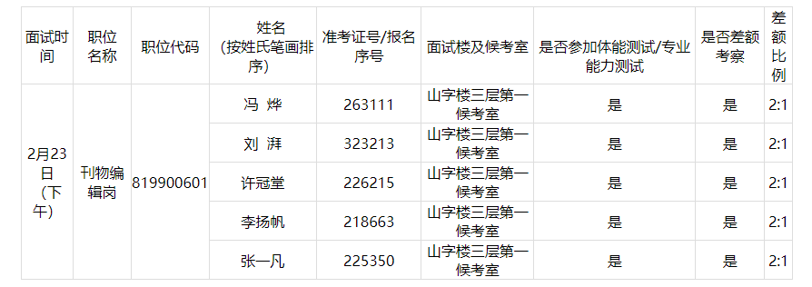 面試簽到時間為面試當(dāng)天下午12:30至13:00,13:00停止簽到入場,請考生務(wù)必按照本人參加面試的場次安排,提前到相應(yīng)面試樓前集合等待簽到。入闈封閉管理時間為本人面試當(dāng)天下午13:00,入闈封閉管理前,未到達(dá)面試樓完成簽到的,視為自動放棄。