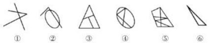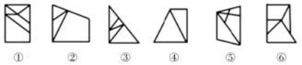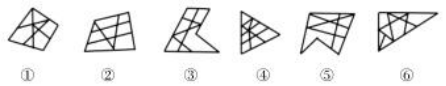 如上圖,圖形被分割成多個封閉區(qū)域,考慮面數(shù)量,面數(shù)量無法分成兩組,進一步觀察發(fā)現(xiàn),每幅圖都有1個最大面,且圖①②⑥中最大面均為四邊形,圖③④⑤中最大面均為三角形。