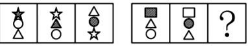 如上圖,元素組成相似,優(yōu)先考慮樣式規(guī)律。前兩個圖形去同存異得到第三個圖形。