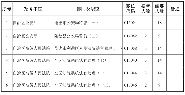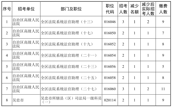 2025年全區(qū)考試錄用公務(wù)員網(wǎng)上報(bào)名、資格初審及繳費(fèi)工作結(jié)束后,有部分職位未達(dá)到筆試開(kāi)考比例。根據(jù)《寧夏回族自治區(qū)2025年考試錄用公務(wù)員公告》中“筆試開(kāi)考比例(職位有效報(bào)名人數(shù)與招錄名額之比)一般為5: 1。定向招考職位、專業(yè)性較強(qiáng)、生源較少的職位以及艱苦邊遠(yuǎn)地區(qū)招考職位筆試開(kāi)考比例可降至3:1。公安系統(tǒng)法醫(yī)、特殊緊缺人才職位,監(jiān)獄機(jī)關(guān)獄醫(yī)等專業(yè)性強(qiáng)的職位筆試開(kāi)考比例可降至2:1。達(dá)不到筆試開(kāi)考比例的職位,減少招考名額或取消招考計(jì)劃。招考計(jì)劃取消的,報(bào)考該職位的考生可改報(bào)其他符合條件的職位”的規(guī)定,經(jīng)研究,取消部分職位招考計(jì)劃、減少部分職位招考名額、降低部分職位筆試開(kāi)考比例。具體如下: