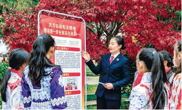 近年來,各地持續(xù)深化法治宣傳教育,增強(qiáng)全民法治觀念,助力法治中國建設(shè)。圖為2024年12月3日,貴州省黔西市人民檢察院干警在新仁苗族鄉(xiāng)化竹小學(xué)為學(xué)生普及憲法知識。新華社發(fā)范暉/攝