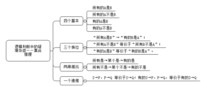 對于集合推理的學(xué)習(xí),我們需要從以下四個角度了解:四個基本,三個換位,兩串推出和一個遞推。接下來一一對這四個考點(diǎn)進(jìn)行解析。