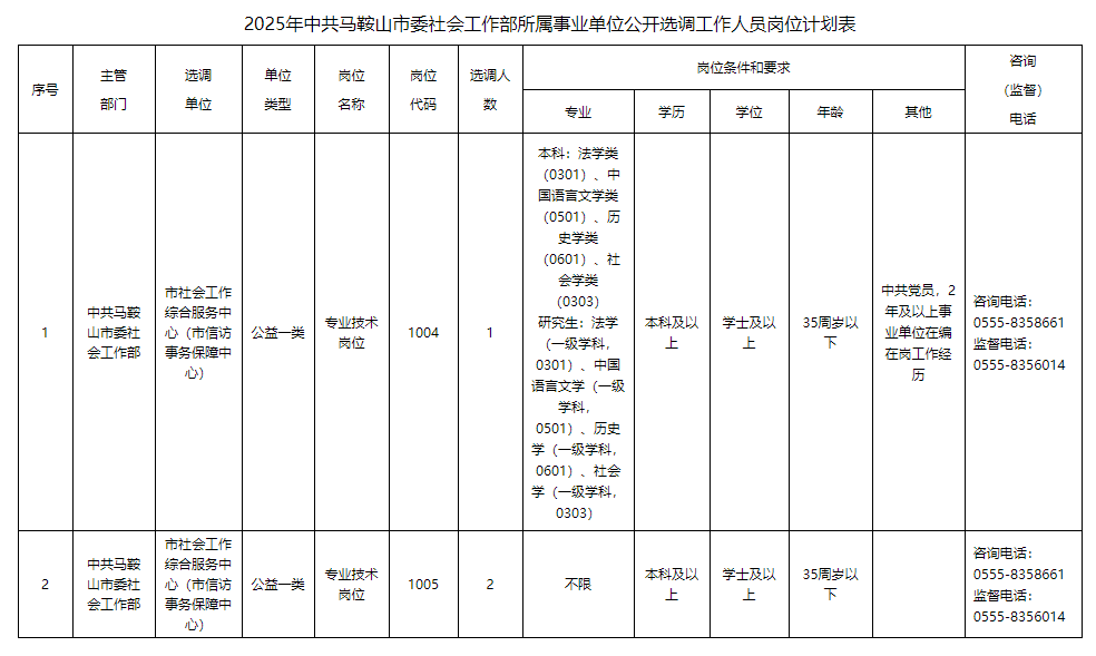 附件:2025年中共馬鞍山市委社會工作部所屬事業(yè)單位公開選調(diào)工作人員崗位計劃表