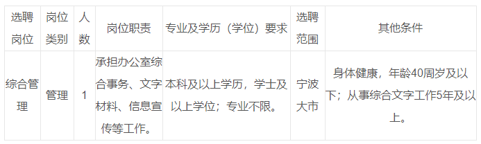 根據(jù)《關(guān)于進(jìn)一步規(guī)范事業(yè)單位工作人員交流的通知》(浙人社〔2018〕24號(hào))《寧波市事業(yè)單位工作人員交流辦法(試行)》(甬人社發(fā)〔2020〕28號(hào))等有關(guān)規(guī)定,寧波市機(jī)關(guān)事務(wù)管理局直屬事業(yè)單位寧波市市級(jí)機(jī)關(guān)后勤服務(wù) 中心擬面向全市公開選聘事業(yè)編制人員1名。