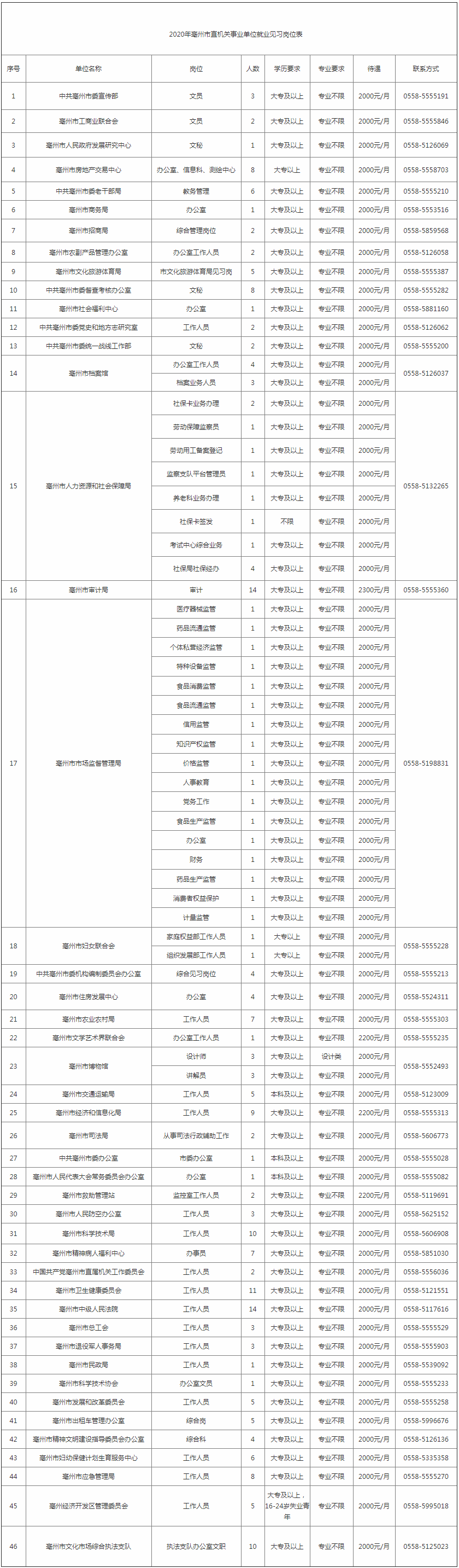 經(jīng)崗位征集審核,現(xiàn)將2020年市直黨政機(jī)關(guān)、事業(yè)單位(含公益一類、參公管理事業(yè)單位)就業(yè)見習(xí)崗位(詳見附件),招募就業(yè)見習(xí)崗位等信息于本公告發(fā)布之日起同步在亳州市人力資源和社會保障局網(wǎng)、亳州公共招聘網(wǎng)統(tǒng)一發(fā)布。
