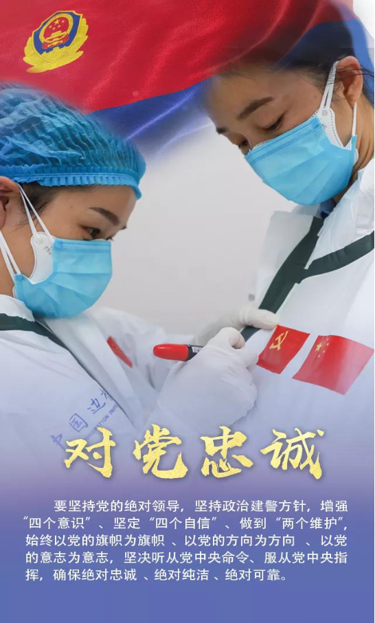 一是對黨忠誠。要堅持黨的絕對領(lǐng)導(dǎo),堅持政治建警方針,增強“四個意識”、堅定“四個自信”、做到“兩個維護”,始終以黨的旗幟為旗幟、以黨的方向為方向、以黨的意志為意志,堅決聽從黨中央命令、服從黨中央指揮,確保絕對忠誠、絕對純潔、絕對可靠。