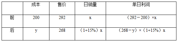 根據前后單日利潤相同列等式,所以有:(292-200)×x=(268-y)×(1+15%)x