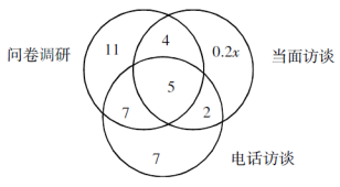 方法二,分析題意,可知總?cè)藬?shù)相當(dāng)于參與問卷調(diào)研和電話訪談的實際人數(shù),再加上只參與當(dāng)面訪談的人數(shù)。設(shè)總?cè)藬?shù)為x,則有27+21-12+0.2x=x,解得x=45。