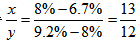 【答案】B。解析:由題意可知:題干中涉及到進口額、出口額、總值的值和增長率。而所求為2011年的出口額和進口額的比值,即他們基期值的比值。而增長量=基期值×增長率,總值又分為進口額和出口額兩個部分。則進口額的增長量+出口額的增長量=總值的增長量。設2011年上半年我國外貿出口額和進口額分別為x、y億美元,則2011年上半年我國外貿進出口總值為x+y億美元。故x·9.2%+y·6.7%= (x+y)×8%,解得