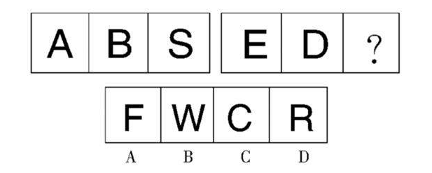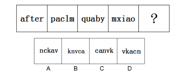 【解析】B。觀察已知字母發(fā)現(xiàn),每組字母中均有字母“a”,并且每個單詞中的“a”字母的位置依次在第1、2、3、4位,下一個應(yīng)該在第5位,因此答案選B。