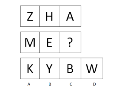 【解析】B。考慮對稱性,圖中前三個字母都是軸對稱圖形,因此第四個字母也應(yīng)該是軸對稱圖形。選項中只有B是軸對稱圖形。