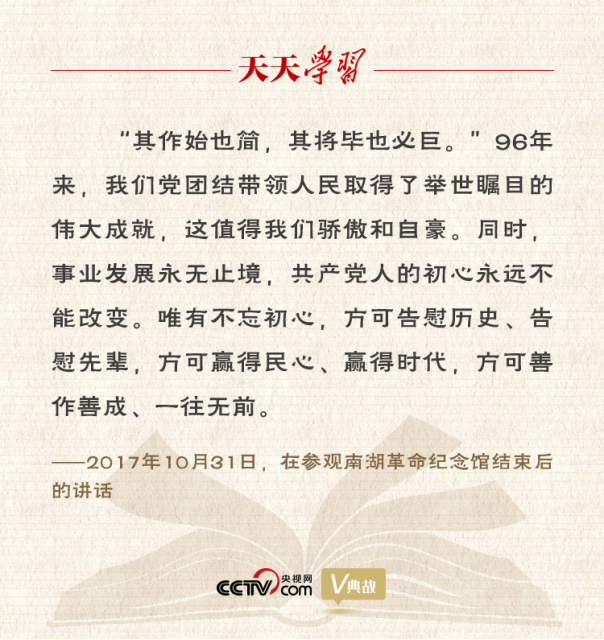 此行中,習近平總書記引用了“其作始也簡,其將畢也必巨”這句古語。他站在歷史和時代的高度,回顧中國共產黨從小到大、從弱到強的光輝歷程,解讀黨的初心,強調學習革命先輩的崇高精神,并號召全黨同志不忘初心、牢記使命、永遠奮斗。習近平總書記的講話激勵全黨全軍全國人民進一步增強責任感和使命感,以永不懈怠的精神狀態(tài)和一往無前的奮斗姿態(tài),繼續(xù)朝著實現中華民族偉大復興的宏偉目標前進。