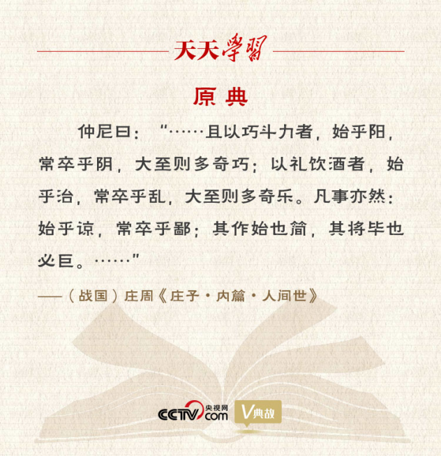 “其作始也簡,其將畢也必巨”見于《莊子·人間世》第二節(jié)。講的是楚王派葉公子高出使北方強國齊國,葉公子高感到責任非常重大,臨行前便向孔子來求教??鬃咏虒~公子高,消除了他出使前的憂懼心理。莊子將孔子塑造成道家的代言人,假借孔子之口,談父子之親、君臣之義。