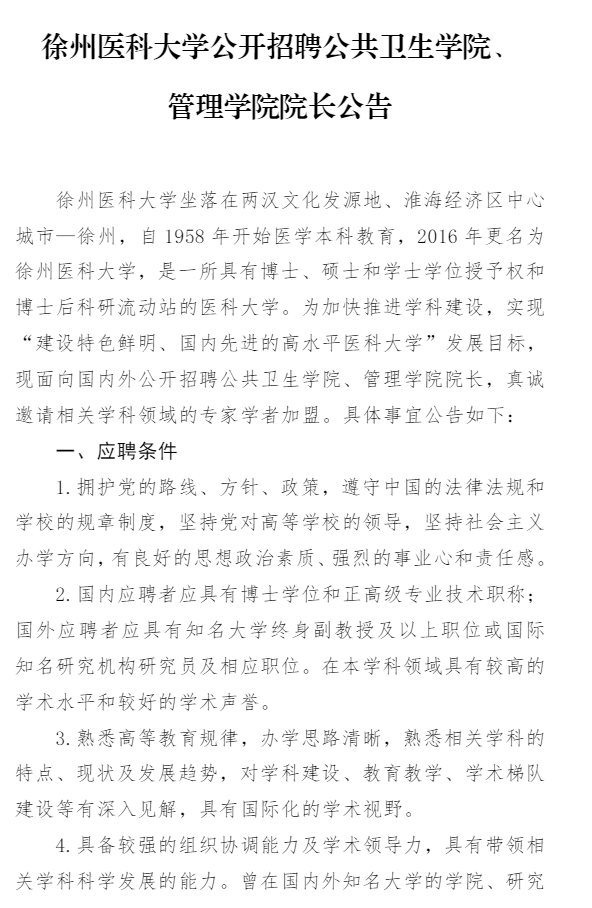 徐州醫(yī)科大學(xué)公開招聘公共衛(wèi)生學(xué)院、管理學(xué)院院長(zhǎng)公告