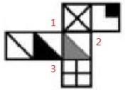 此時我們看到,題目每個選項都是要兩個三角形和×這三個面相連的關(guān)系,根據(jù)剛剛標(biāo)的點,是1連接了這三個面,所以應(yīng)該在黑三角圖中位置方向的右上角,灰色三角圖中位置的左上角,×面的任意位置,根據(jù)這三個位置鎖定答案D。