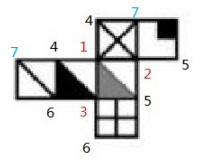 第三步:補齊剩余點:我們看到4,現(xiàn)在一共有兩個4,這兩個4一共連接了三個面,所以4也是一個確定頂點,可以使用頂點法。在平面展開圖外圍,與確定頂點4距離為“1”的點是同一個點,我們剛剛根據(jù)1找到的4,不能再標(biāo)1,這時發(fā)現(xiàn)兩個4兩邊的點都是空的,沒有命名,故命名下一個數(shù)字7.