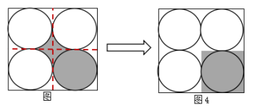 一部分是內(nèi)部小圓的面積,一部分是四個圓中間形成的陰影部分面積,單獨求解四個圓中間形成的陰影部分面積不好求解,可連接正方形四邊的中點,因四個圓兩兩相切,則中線必過切點且與正方形的邊形成四個邊長為2cm的小正方形,且每個圓均與小正方形相切(如圖),此時中間陰影部分被分成四個面積相等的小部分,再將四個小陰影部分稍作旋轉(zhuǎn),均放在一個小正方形中(如圖4),此時陰影部分的面積就變成小正方形的面積2×2=4(cm2),故答案選A。