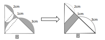 一個不規(guī)則的部分,分別連接兩半圓與等腰三角形兩邊的交點(如圖),根據(jù)直徑對應(yīng)的圓周角是90°,可得兩虛線垂直于斜邊且相互平行,又因為大三角形是等腰三角形,則兩個小三角形也是等腰三角形,所以外部兩個弧形陰影的面積與內(nèi)部兩個弧形的面積相等,故將外部大小兩弧形陰影分別向左、右旋轉(zhuǎn)90°(如圖8),陰影部分面積就轉(zhuǎn)化成了梯形的面積,所以梯形面積為
