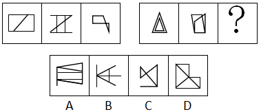 圖形元素組成不同,且無(wú)明顯屬性規(guī)律,考慮數(shù)量規(guī)律。題干中圖形都是多邊形,由多條直線構(gòu)成,考慮直線數(shù),但整體數(shù)直線沒(méi)有規(guī)律,觀察發(fā)現(xiàn)題干圖形出現(xiàn)成對(duì)的平行線,故考慮平行線。如下圖所示,第一組圖中,每幅圖均有2組平行線,第二組圖前兩幅圖均有3組平行線,故問(wèn)號(hào)處圖形要滿足有3組平行線,只有A選項(xiàng)符合。