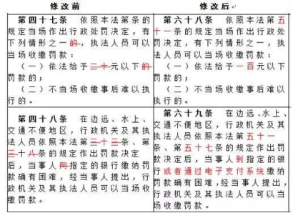 ?提高了當(dāng)場(chǎng)收繳罰款的數(shù)額和范圍 。(20元以下→100元以下)