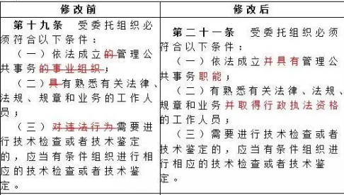 ?對(duì)受委托組織應(yīng)符合的條件作了修改:刪去了“事業(yè)組織”;受委托組織的工作人員也應(yīng)取得行政執(zhí)法資格。