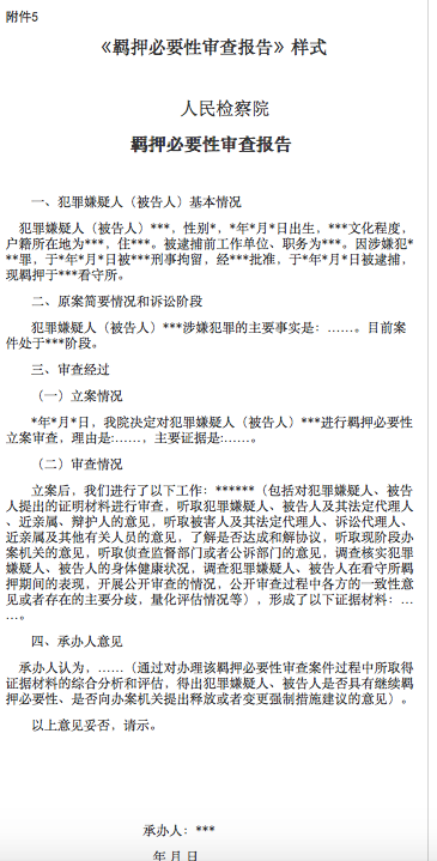 (3)最高人民檢察院《人民檢察院辦理羈押必要性審查案件規(guī)定(試行)》2016年1月13日最高人民檢察院頒布了《人民檢察院辦理羈押必要性審查案件規(guī)定(試行)》,為了加強(qiáng)和規(guī)范羈押必要性審查工作,維護(hù)被逮捕的犯罪嫌疑人、被告人合法權(quán)利具有重要作用。努力發(fā)揮非羈押措施的替代作用,擴(kuò)大使用非羈押措施,保障人權(quán)。(4)最高人民檢察院刑事執(zhí)行檢察廳《關(guān)于貫徹執(zhí)行<人民檢察院辦理羈押必要性審查案件規(guī)定(試行)>的指導(dǎo)意見》該指導(dǎo)意見根據(jù)《人民檢察院辦理羈押必要性審查案件規(guī)定(試行)》指定。該指導(dǎo)意見進(jìn)一步細(xì)化了審查標(biāo)準(zhǔn)、審查內(nèi)容,增加了評估犯罪嫌疑人、被告人有無繼續(xù)羈押必要性可以采取量化方式,設(shè)置加分項(xiàng)目、減分項(xiàng)目、否決項(xiàng)目等具體標(biāo)準(zhǔn)。