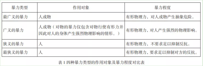 在刑法學(xué)上,根據(jù)“暴力”的程度,可以將其劃分為“最廣義的暴力”“廣義的暴力”“狹義的暴力”以及“最狹義的暴力”四類。首先,最廣義的暴力包括非法實(shí)施有形物理力的所有類型,暴力的對象既包括人、也包括物,不以達(dá)到直接抑制被害人的反抗的程度為判斷的標(biāo)準(zhǔn)。簡言之,最廣義的暴力是以對人或物產(chǎn)生抽象危險(xiǎn)為標(biāo)準(zhǔn)的暴力形式。其次是廣義的暴力,指對人施加有形物理力,但不要求直接對人的身體行使,即使是對物行使有形力并因此對人的身體產(chǎn)生強(qiáng)烈的物理影響,也構(gòu)成暴力。再次,狹義的暴力是指不法對人的身體行使有形力或物理力。廣義的暴力與狹義的暴力之間的關(guān)鍵差異在于對“暴力”作用對象范圍的限制。最后是最狹義的暴力,僅指對人行使有形力并達(dá)到足以抑制對方反抗程度。由此可知,最狹義的暴力是以造成對人的具體危險(xiǎn)為界限的暴力。概括而言,刑法學(xué)意義上的“暴力”在不法程度上有所不同,這樣分類的意義在于通過區(qū)分的“暴力”而影響對行為的定罪量刑,易言之,使得具有不同危害性質(zhì)的罪名在犯罪圈的劃定上呈現(xiàn)梯度。