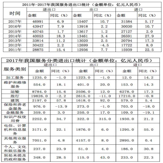 D.2017年我國(guó)服務(wù)進(jìn)出口中,別處未提及的政府服務(wù)進(jìn)出口占比最小