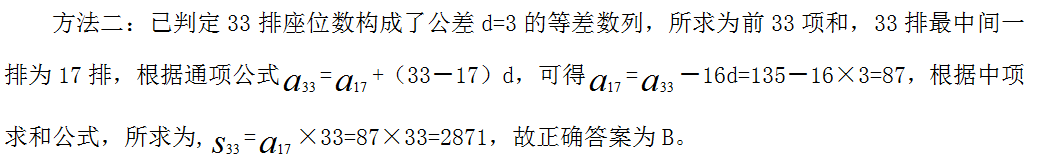 【答案】B?!窘馕觥?/span>方法一:由題干可知,共有33排座位,后一排比前一排多3個,即從第二排開始,后一排座位數(shù)減前一排座位數(shù)為定值3,說明33排座位數(shù)構(gòu)成了公差d=3的等差數(shù)列,已知