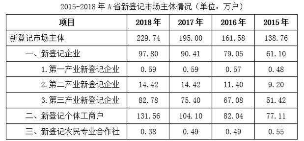 近年來,A.省新登記市場主體保持較快增長勢頭。全省實(shí)有各類市場主體從2015年的775.95萬戶增長到2018年的1146.13萬戶。2018年,全省新登記市場主體229.74萬戶,日均新登記市場主體6294戶,同比增長17.82%。