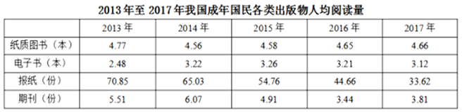 C.2017年我國成年國民人均每天閱讀紙質(zhì)圖書時(shí)長低于閱讀報(bào)紙與閱讀期刊時(shí)長之和