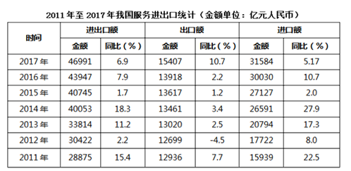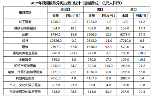 C.2017年我國服務(wù)進(jìn)出口中,其他商業(yè)服務(wù)進(jìn)出口實(shí)現(xiàn)的順差最多
