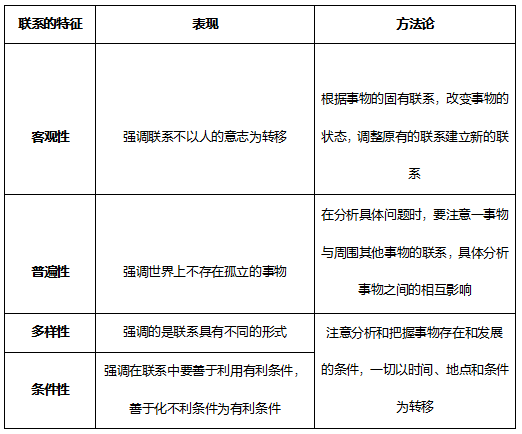 (4)多樣性。事物和現(xiàn)象的聯(lián)系不僅是普遍的,而且這種聯(lián)系的形式和性質(zhì)又是多種多樣的。事物聯(lián)系的形式和性質(zhì)的多樣性,是由物質(zhì)和運(yùn)動(dòng)的形式及關(guān)系的多樣性決定的。