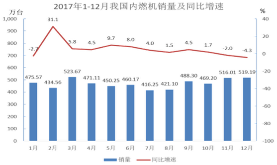 2017年1-12月,全國(guó)內(nèi)燃機(jī)累計(jì)銷量5645.38萬(wàn)臺(tái),同比增長(zhǎng)4.11%,累計(jì)完成功率266879.47萬(wàn)千瓦,同比增長(zhǎng)9.15%,其中柴油內(nèi)燃機(jī)功率同比增長(zhǎng)34%。