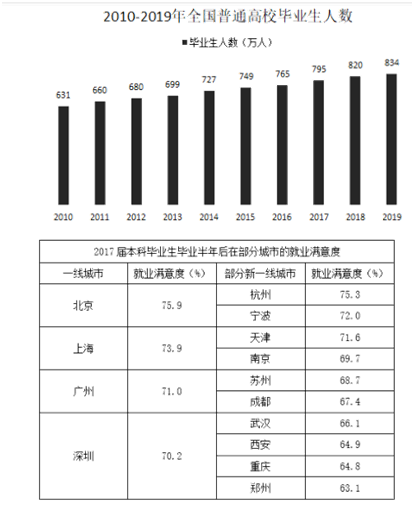 1979年全國普通高校畢業(yè)生人數(shù)為8.5萬人,1980年為14.7萬人,2001年為114萬人,2002年為145萬人,2010年較上一年同比增長3.4%,2018年首次突破了800萬人,2019年預(yù)計(jì)達(dá)到834萬人,畢業(yè)生就業(yè)創(chuàng)業(yè)面臨嚴(yán)峻形勢。