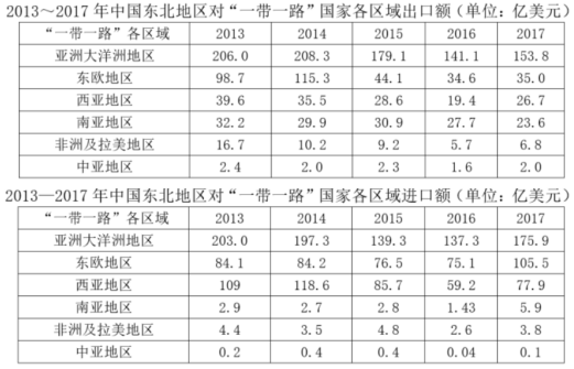 自2013年習(xí)近平主席提出“一帶一路”的戰(zhàn)略構(gòu)想以來(lái),中國(guó)東北地區(qū)積極參與其中,取得了豐碩成果,2013年至2017年中國(guó)東北地區(qū)對(duì)“一帶一路”國(guó)家各區(qū)域進(jìn)出口額如下: