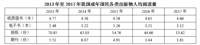 A. 2013年至2017年我國成年國民人均電子書閱讀量逐年上升
