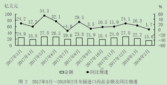 D.2017年1月,全國進(jìn)口藥品金額超過20億美元