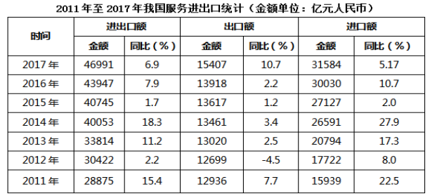 C.2017年我國(guó)服務(wù)進(jìn)出口中,其他商業(yè)服務(wù)進(jìn)出口實(shí)現(xiàn)的順差最多