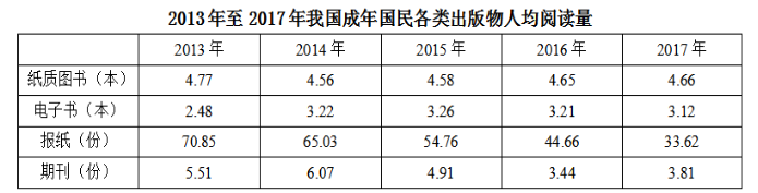 A.2013年至2017年我國(guó)成年國(guó)民人均電子書閱讀量逐年上升