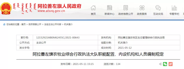 第二條:阿拉善左旗農(nóng)牧區(qū)生態(tài)管理綜合行政執(zhí)法局更名為阿拉善左旗農(nóng)牧業(yè)綜合行政執(zhí)法大隊。為旗人民政府直屬事業(yè)單位,機構(gòu)規(guī)格相當于正科級。
