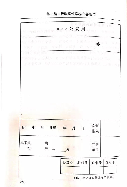 1.案卷封面式樣。行政案件應(yīng)當(dāng)采用統(tǒng)一印制的案卷封面。由于公安部未規(guī)范行政案件案卷的封面式樣,根據(jù)公安部專業(yè)檔案管理相關(guān)規(guī)定,《公安行政法律文書制作與范例》P250設(shè)計了行政案件的案卷封面式樣,供各地參考。
