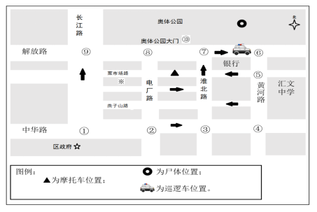 93.某日晚9時(shí)許,奧體公園(注 奧體公園只有一個(gè)大門進(jìn)出)發(fā)生一起搶劫殺人案 家住菜市場(chǎng)路1號(hào)(圖中※標(biāo)識(shí)的位置)的許女士及其丈夫在奧體公園散步時(shí),遭遇到一個(gè)持槍搶劫犯的襲擊,許女士被槍擊身亡(圖中黑圈O標(biāo)識(shí)的尸體位置),其丈夫重傷,他們被搶手機(jī)兩部,金項(xiàng)鏈、金耳環(huán)各一條,挎包一個(gè)。公安機(jī)關(guān)立即展開偵査,應(yīng)査看監(jiān)控錄像的先后順序是(圖片中的順序號(hào)即為視頻監(jiān)控)( )(單選)