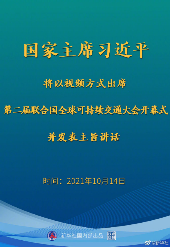 新華社北京10月13日電 外交部發(fā)言人華春瑩13日宣布:國(guó)家主席習(xí)近平將于10月14日以視頻方式出席第二屆聯(lián)合國(guó)全球可持續(xù)交通大會(huì)開(kāi)幕式并發(fā)表主旨講話(huà)。