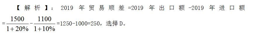 例:2020年某地對外出口總額1500萬元,同比增長了20%;自外進口總額1100萬元,同比增長了10%,則2019年該地的貿(mào)易順差為多少萬元?