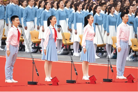 2021年7月1日上午,慶祝中國(guó)共產(chǎn)黨成立100周年大會(huì)在北京天安門(mén)廣場(chǎng)隆重舉行。這是共青團(tuán)員和少先隊(duì)員代表集體致獻(xiàn)詞。 新華社記者 李尕/攝