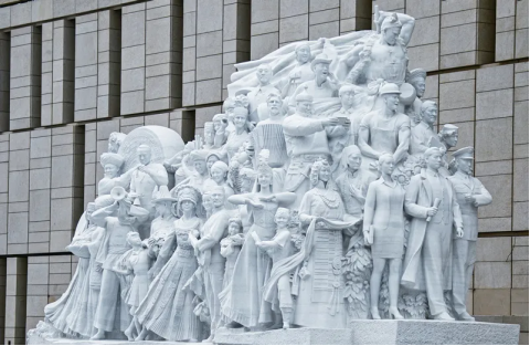 中國(guó)共產(chǎn)黨歷史展覽館西側(cè)廣場(chǎng)上矗立的《信仰》、《偉業(yè)》、《攻堅(jiān)》、《追夢(mèng)》四組大型雕塑,分別對(duì)應(yīng)“四個(gè)偉大”主題。在雕塑《追夢(mèng)》中,73位人物形象融入主體之中,形成團(tuán)結(jié)一致、闊步前行的恢宏陣勢(shì),重點(diǎn)表現(xiàn)全國(guó)各族人民在中國(guó)共產(chǎn)黨的團(tuán)結(jié)帶領(lǐng)下,為了實(shí)現(xiàn)民族復(fù)興,在百年接續(xù)奮斗中走中國(guó)道路、弘揚(yáng)中國(guó)精神、凝聚中國(guó)力量,堅(jiān)毅前行的豪邁氣概。 劉新武/攝
