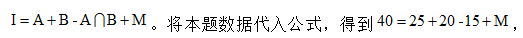 【答案】C【解析】我們同樣可以利用文氏圖對題干信息進(jìn)行簡單梳理。如用集合I表示員工總?cè)藬?shù),集合A、B、C分別表示訂閱A、B、C期刊的人數(shù),則根據(jù)例題1,我們可以類比得出三者容斥的解題公式,即: