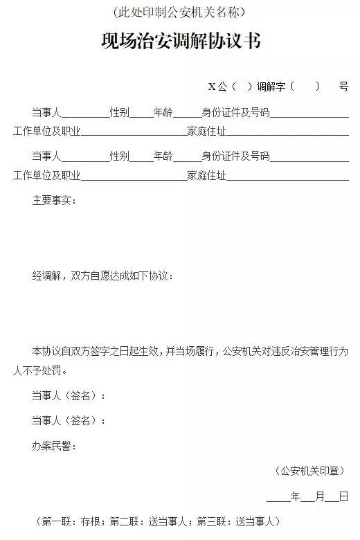 現(xiàn)場(chǎng)調(diào)解達(dá)成協(xié)議的,應(yīng)當(dāng)制作《現(xiàn)場(chǎng)治安調(diào)解協(xié)議書(shū)》一式三聯(lián)(式樣附后),由雙方當(dāng)事人簽名。