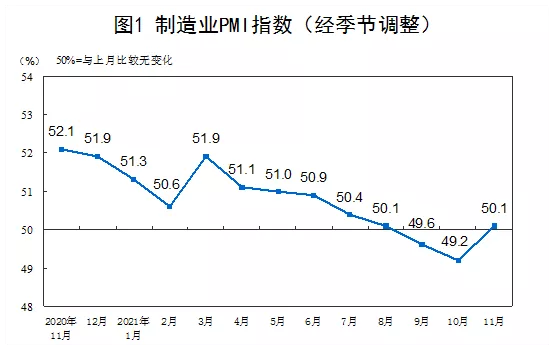 11月份,制造業(yè)采購(gòu)經(jīng)理指數(shù)為50.1%,比10月上升0.9個(gè)百分點(diǎn)。